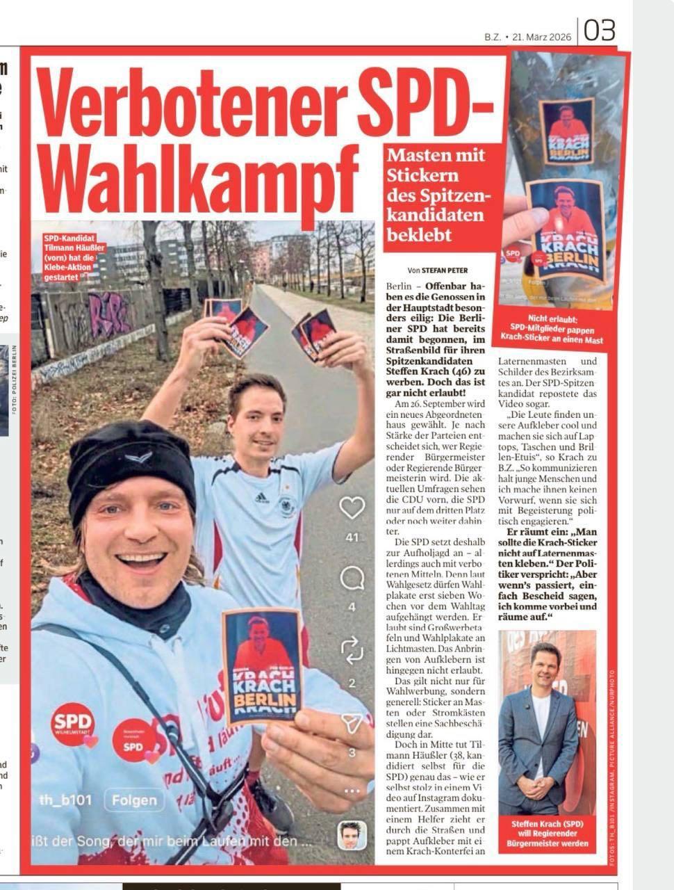 Ich bin Tilmann (Häußler), 38 Jahre alt und interessiere mich neben Politik noch für Fußball, Hip-Hop & Graffiti. Ich bin ein Ur-Berliner, aufgewachsen im sozialen Wohnungsbau am Zionskirchplatz. Meine Eltern leben heute noch da, meine Schwester in der Nähe vom Fußballplatz von Bero und ich wohne mit meiner eigenen Familie (Frau & Tochter) in der Nähe vom Naturkundemuseum. Ich konnte also in meinem Kiez bleiben. Und jetzt? Jetzt möchte ich für die Menschen aus meinem Kiez, für die Menschen in Berlin, gern Politik im Berliner Abgeordnetenhaus machen.