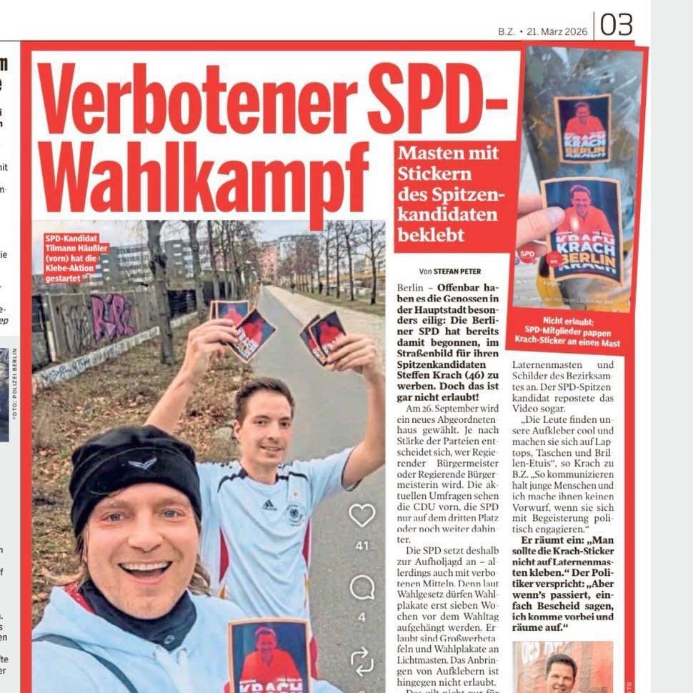 Die SPD setzt deshalb zur Aufholjagd an – allerdings auch mit verbotenen Mitteln. Das Anbringen von Aufklebern ist hingegen nicht erlaubt. Doch in Mitte tut Tilmann Häußler (38, kandidiert selbst für die SPD) genau das – wie er selbst stolz in einem Video auf Instagram dokumentiert. Zusammen mit einem Helfer zieht er durch die Straßen und pappt Aufkleber mit einem Krach-Konterfei an Laternenmasten und Schilder des Bezirksamtes an.